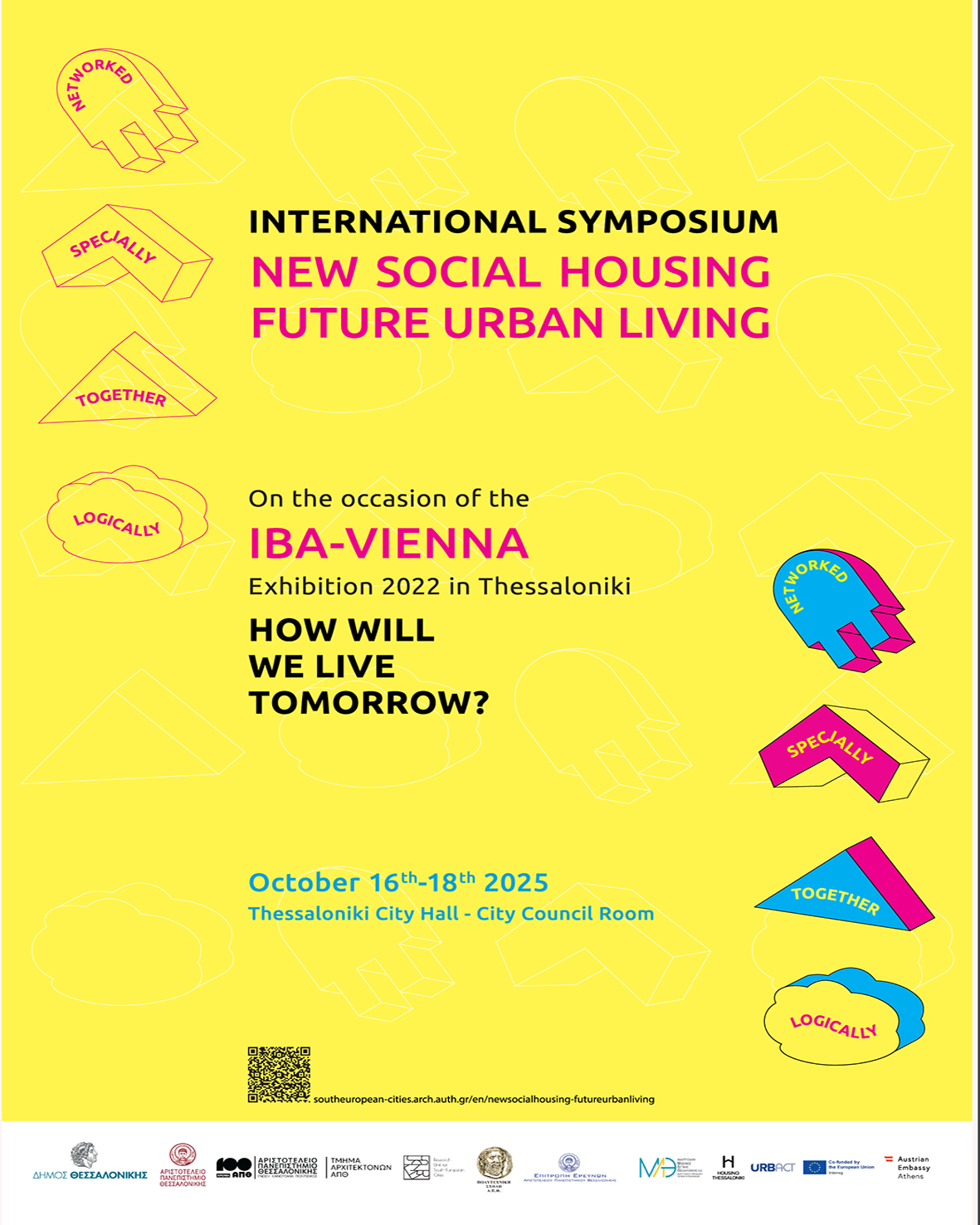ΙΒΑ Βιέννης – Θεσσαλονίκη # 03 / Πέμπτη 16 Οκτωβρίου 2025, ώρα 18:00 Έναρξη @ ΔΗΜΑΡΧΕΙΟ ΘΕΣΣΑΛΟΝΙΚΗΣ – Αίθουσα Δημοτικού Συμβουλίου / Διεθνές Συμπόσιο: Νέα Κοινωνική Κατοίκηση – Μελλοντική Αστική Διαβίωση / Διάρκεια: 16-18 Οκτωβρίου 2025