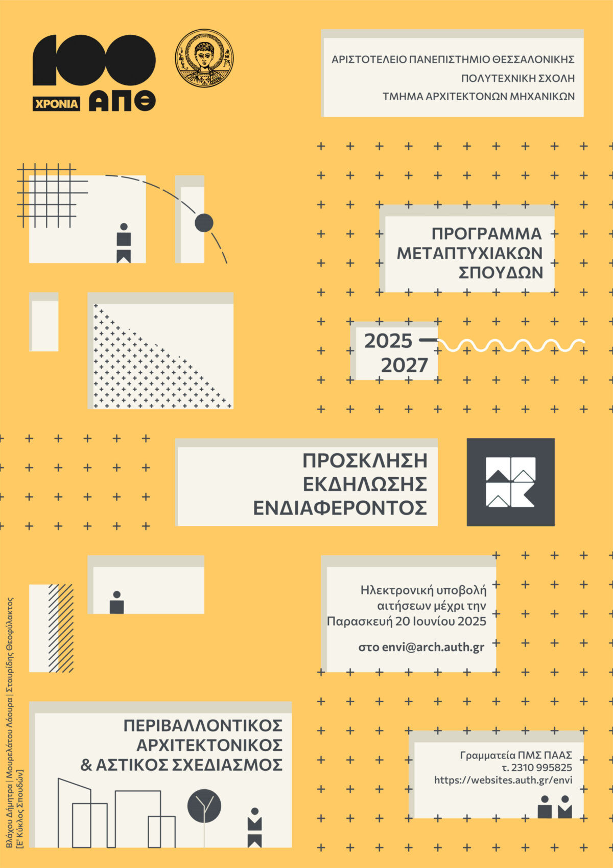 Το Τμήμα Αρχιτεκτόνων Μηχανικών της Πολυτεχνικής Σχολής του ΑΠΘ προτίθεται να λειτουργήσει το Πρόγραμμα Μεταπτυχιακών Σπουδών (ΠΜΣ) με τίτλο: «Περιβαλλοντικός Αρχιτεκτονικός και Αστικός Σχεδιασμός» (ΦΕΚ 5714/Τεύχος Δεύτερο/16.10.2024, ΥΑ 10845/08.10.2024) για την ακαδημαϊκή διετία 2025–2027, απευθύνοντας ανοιχτή πρόσκληση εκδήλωσης ενδιαφέροντος για την πλήρωση έως 35 θέσεων μεταπτυχιακών φοιτητών/φοιτητριών.