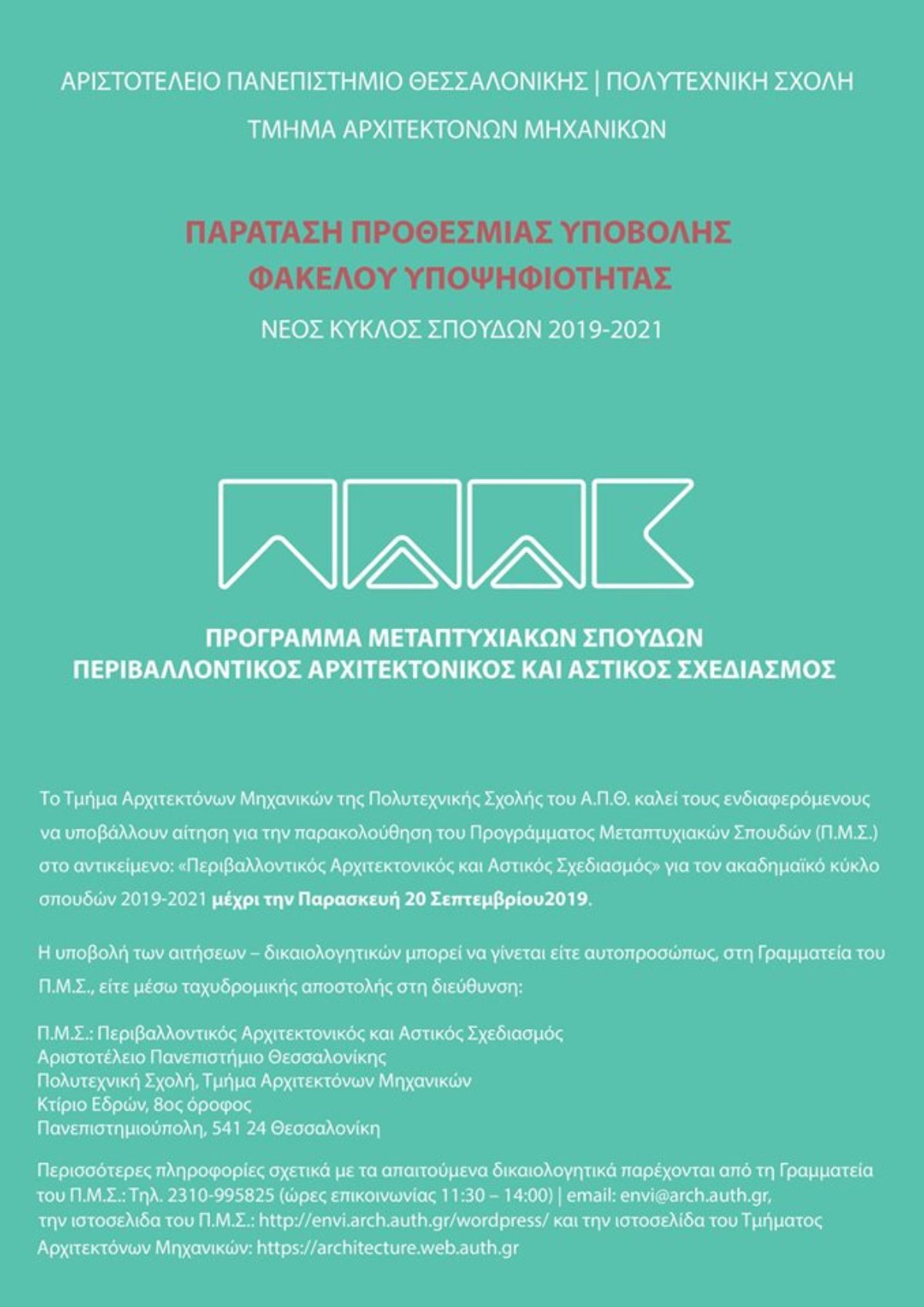 Παράταση Προθεσμίας Υποβολής Φακέλου Υποψηφιότητας για τον Κύκλο Σπουδών 2019-2021 στο ΠΜΣ «Περιβαλλοντικός Αρχιτεκτονικός και Αστικός Σχεδιασμός» του Τμήματος Αρχιτεκτόνων Μηχανικών της Πολυτεχνικής Σχολής του ΑΠΘ –